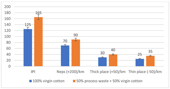 The imperfection index (IPI), which assesses thick places, neps, and thin places, is shown in Figure 4. The results demonstrate that yarns with 50% process waste have a higher IPI compared to those made from 100% virgin cotton. This increased imperfection index highlights the presence of more defects, like thick places, thin places, and neps, in the yarn containing process waste. The process waste’s shorter fibers contribute to a greater incidence of these imperfections, which can detrimentally affect the overall yarn quality. Additionally, fibers from process waste often undergo multiple mechanical stresses during their initial use, which can result in increased fiber breakage and a higher generation of unwanted defects such as thick and thin places. A high IPI negatively influences not only the spinnability of the yarn but also its downstream applications in weaving and knitting, potentially causing issues like increased breakage rates and an irregular fabric appearance. Understanding and mitigating these imperfections will be crucial for enhancing the marketability of yarns produced from process waste. To mitigate these defects, process optimization strategies, such as controlled fiber mixing and improved spinning techniques, should be considered.
