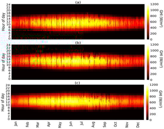 Figure 7). As shown, hydrogen production closely follows the GHI pattern. Notably, the locations studied demonstrate consistent hydrogen production, exceeding 100 kg for approximately five hours daily throughout the year. During the spring, production sees a significant increase, with hydrogen yields surpassing 150 kg for at least three hours daily, particularly from 11:00 a.m. to 2:00 p.m.
