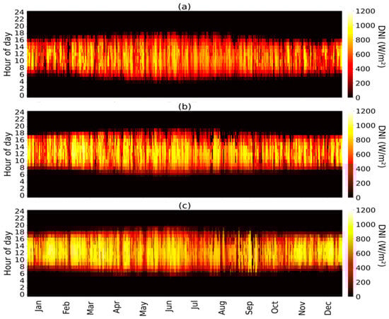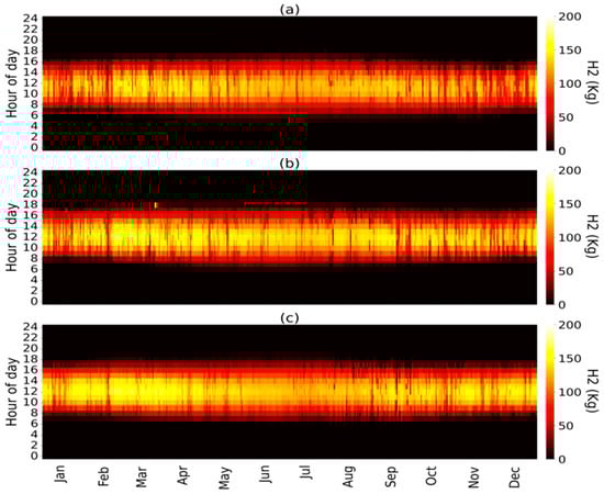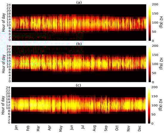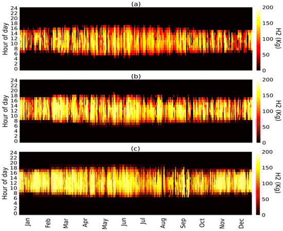 Figure 13. A key observation is that the hydrogen production profile demonstrates an increase in production compared to the PV system, as well as a higher level of consistency compared to the SD-CSP system. The increased red areas indicate higher hydrogen production levels. Notably, the hydrogen production exceeds 100 kg/day for all three locations throughout the year, lasting at least 8 h per day during spring and summer, and 6 h per day during winter and fall. This results in an additional 3 h of production (exceeding 100 kg/day) compared to the PV system alone.