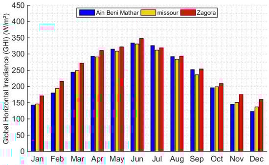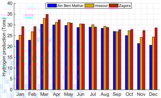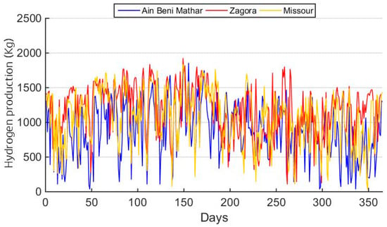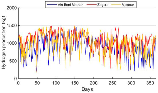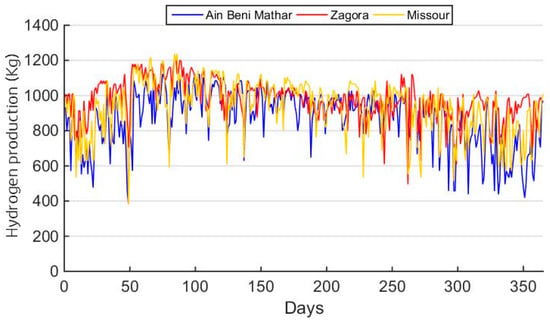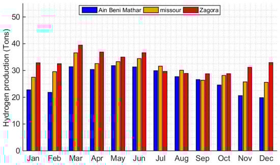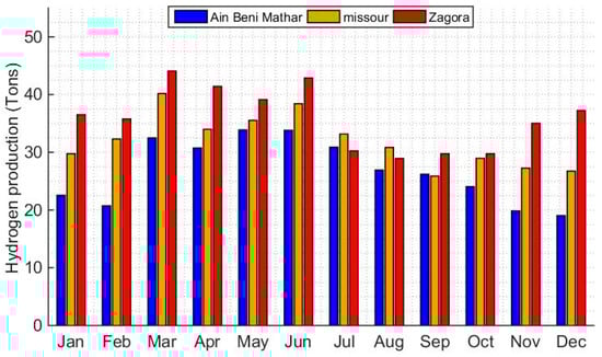 Figure 10. The key observation is that the longest daily period of hydrogen production, lasting approximately 8 h, occurs during the spring and summer. For example, in June at Ain Beni Mathar, hydrogen production exceeding 160 kg lasts for 8 h per day. However, in fall and winter, the number of production hours decreases, although the amount of hydrogen produced per hour increases. This trend is consistent across all locations, with Zagora showing a more pronounced effect. In February, for instance, Zagora experiences hourly hydrogen production ranging between 175 and 190 kg for a continuous 7 h period.