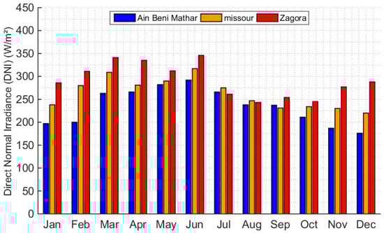 Figure 15 presents the hydrogen production from the hybrid PV/SD-CSP system across Ain Beni Mathar, Missour, and Zagora. Hydrogen production varies across these sites, with monthly averages of 26.1 tons, 31.1 tons, and 34.9 tons, respectively. All sites show higher production in spring (March–June) and lower output in winter, driven by solar radiation levels. Zagora consistently leads in hydrogen production due to superior solar resources, especially high DNI for the SD-CSP system, followed by Missour. Ain Beni Mathar shows the lowest output, reflecting its lower solar resource. Overall, the hybrid PV/SD-CSP system ensures stable hydrogen production year-round, highlighting the importance of site-specific solar conditions.