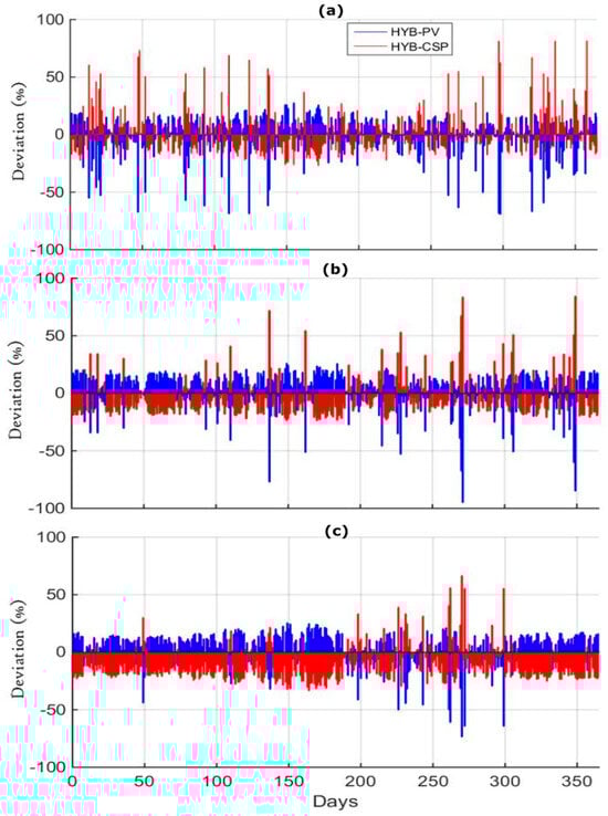 For a more comprehensive analysis, the deviation between the hybrid system and the individual PV and CSP systems was evaluated. The deviation is presented as a daily percentage throughout the year, as shown in