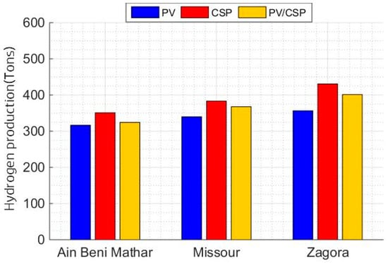Overall, from a technical perspective, the 10 MW CSP-SD/PV hybrid can annually produce a higher amount of hydrogen than the photovoltaic system, with an increase of 11.2% for Zagora, 7.6% for Missour, and 2.5% for Ain Beni Mathar.