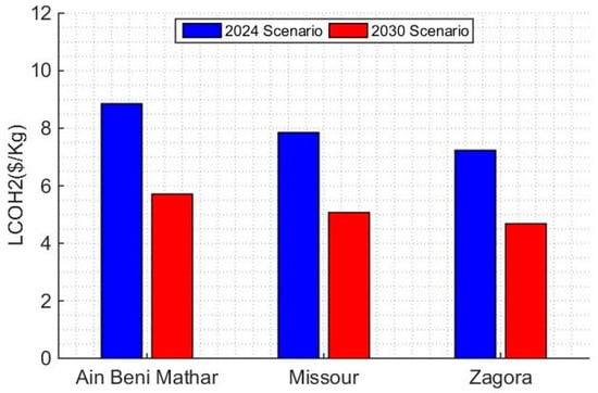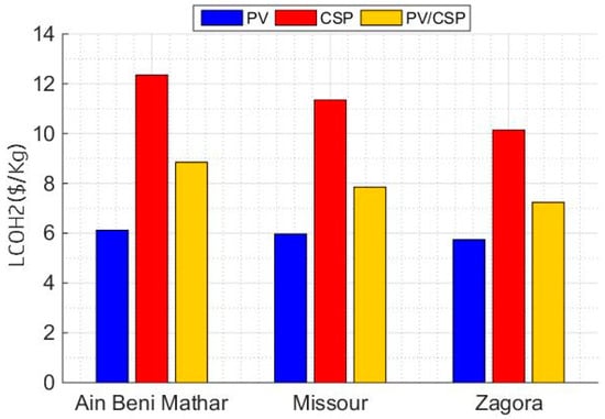 This is attributed to the elevated investment and equipment costs and the developmental immaturity of CSP-SD in comparison to the photovoltaic system. Specifically, the LCOH2 for CSP-SD reaches 10.14 $/kg for Zagora, 11.34 $/kg for Missour, and 12.34 $/kg for Ain Beni Mathar. In contrast, the cost of hydrogen produced through the PV system is relatively lower, standing at 5.74 $/kg, 5.96 $/kg, and 6.11 $/kg for Zagora, Missour, and Ain Beni Mathar, respectively.