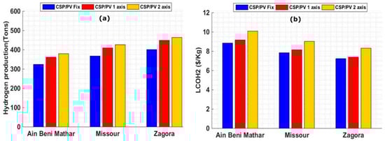 Figure 19 clearly depicts that integrating tracking systems into the hybrid SD-CSP/PV system enhances hydrogen production compared to the configuration without tracking systems. The tracking systems optimize solar energy capture by adjusting the position of the panels to follow the sun throughout the day. Specifically, the SD-CSP/PV system with a one-axis tracking system yields an annual hydrogen production of 449.18 Tons for Zagora, 409.90 Tons for Missour, and 361.11 Tons for Ain Beni Mathar.