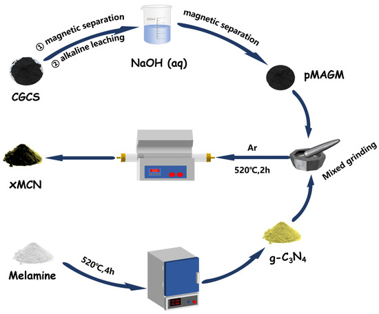The preparation method of MCN is shown in Figure 1. Weighing 1 g of g-C3N4 (The synthesis of g-C3N4 is described in Text S1, and all subsequent abbreviations are CN) powder in a mortar and pestle, 100 mg, 500 mg, and 900 mg of p MAGM material were added according to the mass ratios of 10%, 50%, and 90%, respectively. Then, the mixture was fully ground to make a homogeneous mixture of the two. The mixed materials were placed in a tube furnace under an argon atmosphere, and the calcination procedure was set as follows: the target temperature was 520 °C, the temperature increase rate was 10 °C/min, and the holding time was 2 h. At the end of calcination, the yellow-brown powder was obtained and labeled as 10% MCN, 50% MCN, and 90% MCN, respectively.