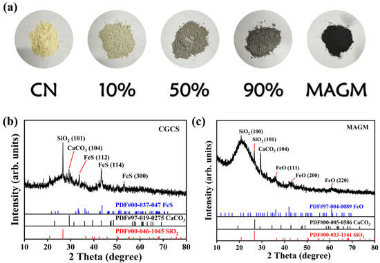 From Figure 2a, CN appears as a typical light yellow, while MAGM exhibits a deep black colour. With the increasing amount of MAGM, the composite material gradually darkens in colour. MAGM is formed from gasification coarse slag after magnetic separation, alkaline leaching, and calcination. As shown in Figure 2b, the primary crystalline components of the gasification coarse slag are SiO2, CaCO3, and FeS. However, the crystalline components of MAGM include SiO2, CaCO3, and FeO. FeO is likely derived from the alkaline leaching and calcination process [21]. Specifically, FeS reacts with NaOH as follows: FeS + 2NaOH → Na2S + Fe(OH)2. Under high-temperature conditions with an Ar atmosphere, Fe(OH)2 decomposes to form FeO. The diffraction peaks at 36.2°, 43.4°, and 60.9° in MAGM correspond to the (111), (200), and (220) crystal planes of FeO, respectively, which accounts for the magnetic properties of MAGM (Figure 2c).