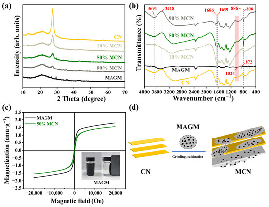 (a) X-ray diffraction spectra of magnetic composite photocatalytic materials; (b) FT-IR spectroscopy of magnetic composite photocatalytic materials; (c) Hysteresis loops for MAGM and 50% MCN; (d) Schematic diagram of CN and MAGM composite process.