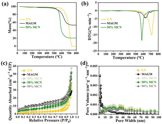 CN, MAGM and 50% MCN thermogravimetric (a) and DTG (b); N2 adsorption-desorption curve (c) and pore distribution (d) of magnetic composite photocatalytic materials.