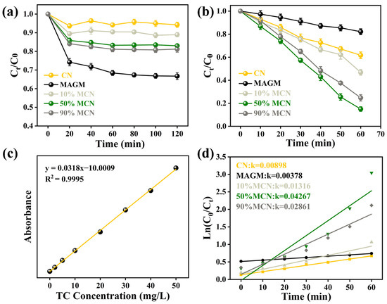 (a) Dark adsorption of TC by the magnetic composite photocatalytic material; (b) Degradation of TC under light irradiation; (c) Standard curve of TC; (d) First-order kinetic fitting of the photocatalytic degradation.