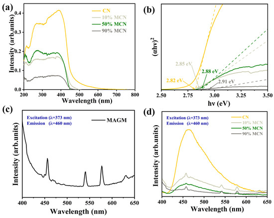 (a) UV-Vis Diffuse Reflectance Spectroscopy (DRS); (b) Bandgaps of different samples; (c) Photoluminescence (PL) spectrogram of MAGM; (d) Photoluminescence spectrograms of CN and x MAGM.