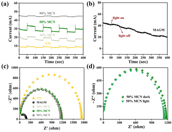 (a) Transient photocurrent responses of CN, 10% MCN, 50% MCN, and 90% MCN; (b) Transient photocurrent response of MAGM; (c) Impedance fitting spectra of CN, MAGM, 10% MCN, 50% MCN, and 90% MCN; (d) Impedance fitting spectra of 50% MCN under light and dark conditions.