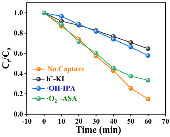 To clarify the mechanism of photocatalytic degradation of TC, we designed reactive oxygen species (ROS) trapping experiments. Under visible light irradiation, the composite photocatalyst achieved a degradation rate of 82% for TC. Upon the addition of a hole scavenger (KI), the degradation rate of TC was significantly inhibited, reducing to only 35%. When isopropanol (IPA) was used to capture hydroxyl radicals, the degradation rate of TC decreased to 43%. Similarly, the addition of ascorbic acid (ASA) as a scavenger for superoxide radicals resulted in a degradation rate of 57%. These experimental results suggest that holes, hydroxyl radicals, and superoxide radicals all play an active role in the degradation of TC (Figure 9). Therefore, the possible mechanisms for degrading TC are as follows (Equations (1)–(4)), and combined with HPLC-MS to analyse the m/z of various by-products produced during the degradation process (Table S4), it was concluded that the possible pathways for TC degradation by MCN are shown in Figure S2.
