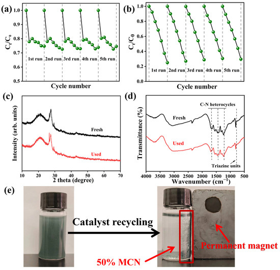 The ability of photocatalysts to be recycled is a prerequisite for practical applications. As shown in Figure 10a,b, the 50% MCN composite was tested for TC degradation over five cycles. After five dark adsorption cycles, the removal efficiency of TC through adsorption was 12%, with a decrease of 20% in adsorption efficiency. Under visible light irradiation, the degradation rate of TC after five cycles reached 70%, with a 14% reduction in photocatalytic degradation efficiency. The XRD patterns before and after cycling revealed that the SiO₂ diffraction peak at 26.5° was enhanced after the cyclic degradation process. MAGM is a magnetic carbon-silicon composite with a porous structure, mainly carbon and silicoaluminate minerals coated with each other, and some CN and MCN are also covered on the surface after the composite with CN. Therefore, residual carbon and surface coverings may have been washed off from the surface of the catalyst during the reaction cycle, thus exposing the MAGM-enhanced SiO₂ peak (Figure 10c). No significant changes were observed in the infrared (FT-IR) spectra before and after the cycles, indicating the structural stability of the composite (Figure 10d). After five cycles, the wastewater could still be effectively treated, and the catalyst powder could be recovered using a magnet (Figure 10e). Therefore, the 50% MCN composite exhibits stable recycling performance and holds great potential for practical applications.