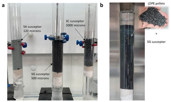 - Rajasekhar Reddy, B.; Malhotra, A.; Najmi, S.; Baker-Fales, M.; Coasey, K.; Mackay, M.; Vlachos, D.G. Microwave Assisted Heating of Plastic Waste: Effect of Plastic/Susceptor (SiC) Contacting Patterns. Chem. Eng. Process.-Process Intensif. 2022, 182, 109202. [Google Scholar] [CrossRef]
