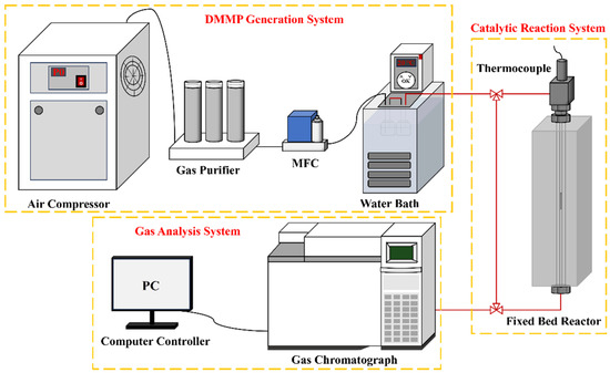 In this study, the catalytic reaction products were analyzed online employing a CATLAB catalytic microreactor (Hiden Ltd., Warrington, UK), which includes a steam generation system, a temperature-programmed reactor, and an online mass spectrometer. Prior to the experiment, helium gas (80 mL/min) was passed through the microreactor to purge the catalyst sample at 300 °C for 2 h. The catalyst loading was 100 mg. Following the experiment, the heating program was initiated, and the thermostatic water bath was maintained at 10 °C. An argon/oxygen mixture (20% O2/80% Ar) was continuously supplied at 50 mL/min to generate DMMP vapor. The temperature was gradually increased from 30 °C to 400 °C at a rate of 10 °C/min, and the tail gas concentration was analyzed using an HPR-20 online mass spectrometer (Hiden Ltd., Warrington, UK).