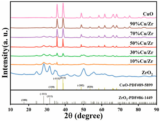 The SSA and pore structure characteristics of Cu/Zr catalysts with varying loading ratios were measured and are outlined in Table 1. It was observed that the actual loading ratios exceeded the theoretical values, which can be attributed to the partial loss of ZrO2 support during the secondary hydrothermal treatment in NaOH solution, resulting in higher actual loading ratios. Furthermore, the data (Table 1) indicate that both the SSA and PV of the catalysts reduced as the Cu/Zr loading ratio increased. On the other hand, the average pore size exhibited an increasing trend with higher Cu/Zr content.