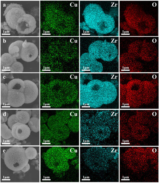 The SEM and HRTEM images of ZrO2, CuO, and CuO/ZrO2 catalysts with varying loading ratios are presented in Figure 3. As depicted in Figure 3a, the ZrO2 catalyst consists of hollow microspheres composed of fine nanoparticles with rough surfaces. The size of the hollow microspheres ranges from 0.5 μm to 2.5 μm, with a wall thickness of approximately 200 nm. The CuO catalyst exhibits an irregular flake-like morphology (Figure 3g). From Figure 3b–f and the mapping images in Figure 4, it is evident that the hollow microsphere structure of ZrO2 is preserved after CuO loading, with Cu being uniformly distributed on the surface of the ZrO2 hollow microspheres. When the Cu/Zr ratio reaches 50%, some CuO flaky structures begin to appear (Figure 3d).