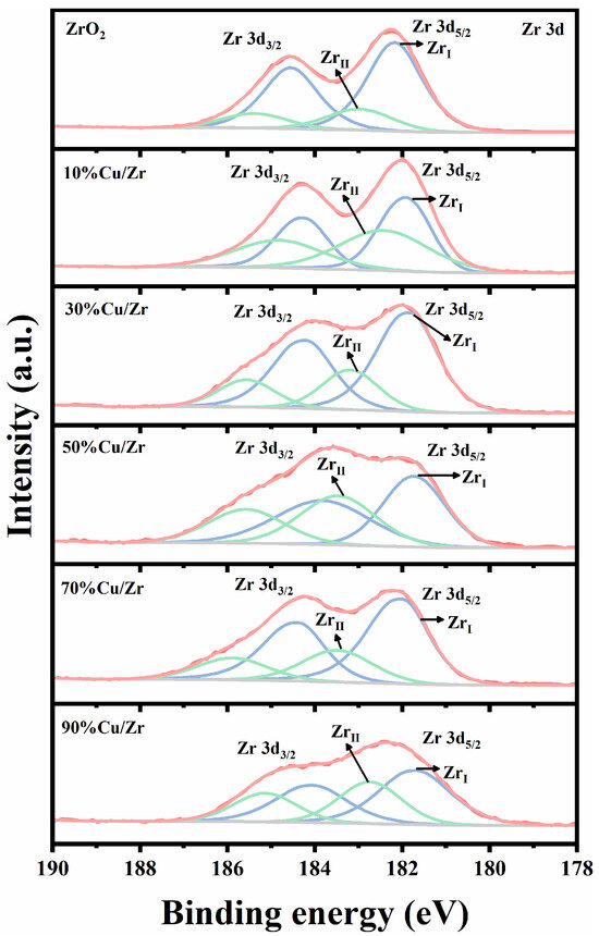 XPS analysis was systematically employed to characterize the surface composition of as-prepared ZrO2, CuO, and CuO/ZrO2 catalysts with varying Cu/Zr ratios (10%, 30%, 50%, 70%, and 90%), as comprehensively illustrated in Figure 5, Figure 6 and Figure 7. Figure 5 shows the Zr 3d XPS spectra of ZrO2 and CuO/ZrO2 catalysts. The prepared pure ZrO2 catalysts exhibit two spin orbitals in the Zr 3d energy level, 3d5/2 (182.0 eV) and 3d3/2 (184.4 eV), with a 2.4 eV difference in their binding energy difference, consistent with the data in references [33,34,35]. According to reference [35], the characteristic peaks of the Zr 3d profile can be ascribed to the existence of two Zr species, namely the relatively low-binding-energy ZrI species, and the relatively high-binding-energy ZrII species. A Gaussian–Lorentz function was used to fit them, and the percentage of ZrI species was computed using the fitting results as shown in Table 2. Relative to ZrO2, the Zr 3d peaks in the CuO/ZrO2 spectrum shift to lower binding energies, suggesting a weakening of Zr-O-Zr interactions and a progressive enhancement of Zr-Cu interactions [36]. It is noteworthy that the proportion of ZrI species is greater than that of ZrII species in all samples.