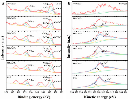 Figure 6 presents the Cu 2p and Cu Auger spectra of CuO/ZrO2 and pure CuO catalysts. In Figure 6a, the Cu 2p spectrum shows a pair of distinct characteristic peaks at 933.6 eV (2p3/2) and 953.4 eV (2p1/2), accompanied by strong satellite peaks in the 937–948 eV range. This confirms the presence of Cu2+ in the catalysts; however, the presence of Cu1+ and Cu0 cannot be definitively determined. Since the 2p3/2 binding energies of Cu1+ and Cu0 are too proximate to be distinguished by XPS alone, further analysis using Cu Auger spectra is required. Figure 6b displays the fitted Cu Auger spectra, obtained via the nonlinear least squares method, to identify Cu1+ or Cu0 in CuO/ZrO2 catalysts with varying Cu/Zr ratios. Importantly, the spectrum of the 10%Cu/Zr catalyst could not be fitted, likely due to the low Cu content, resulting in a weak signal-to-noise ratio. Compared to pure CuO, CuO/ZrO2 catalysts exhibited an increasing trend in Cu 2p binding energies across different Cu/Zr ratios, indicating alterations in the charge environment of Cu species during doping [34,37]. In addition, as CuO doping increased, the Cu 2p binding energy displayed a decreasing trend, which may be associated with a reduction in the oxidation state of Cu species [38].