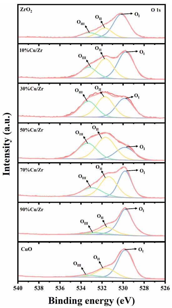 Figure 7 shows the O 1s XPS spectra of ZrO2, CuO/ZrO2, and CuO catalysts. The O 1s spectral peaks of the prepared catalysts can be fitted into three peaks [36,39,40,41]: the lattice oxygen species with binding energies in the range of 529.4–530.1 eV (denoted as OI), the oxygen vacancies with binding energies in the range of 531.3–531.7 eV (denoted as OII), and surface-adsorbed or -bound oxygen species with binding energies in the range of 532.7–533.5 eV (denoted as OIII). The proportion of OI, OII, and OIII species to all O species is calculated in Table 2. The data revealed that in CuO/ZrO2 catalysts, lattice oxygen species initially decreased and then increased with rising CuO doping levels, while oxygen vacancies and surface-adsorbed/bonded oxygen species exhibited the opposite trend.