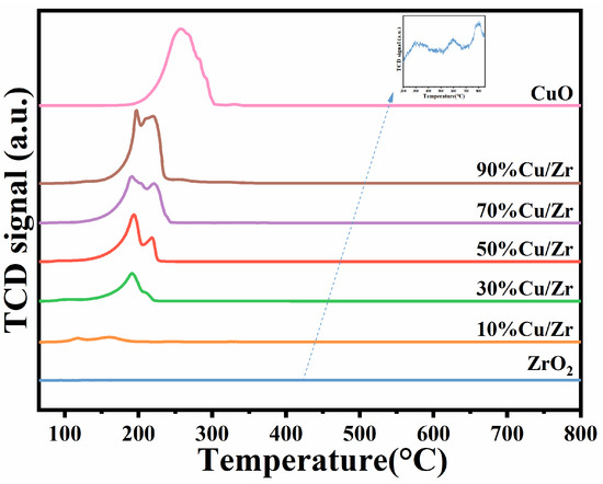 H2 consumption amounts of ZrO2, CuO/ZrO2, and CuO catalysts.