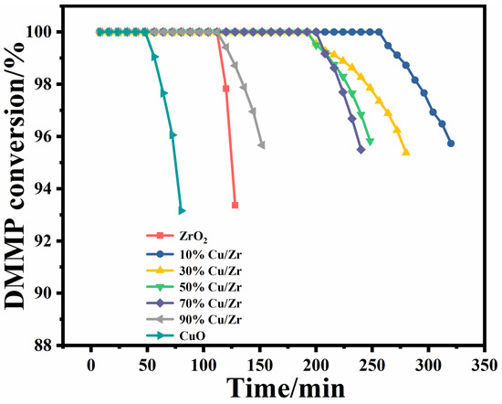 The protection time is a core determinant for assessing the catalysts’ performance for thermocatalytic DMMP decomposition [18]. The protection times of the seven catalysts are shown in Figure 9 and Table 4. The protection times of the catalysts followed a descending order: 10%Cu/Zr (272 min) > 30%Cu/Zr (220 min) > 50%Cu/Zr (212 min) > 70%Cu/Zr (208 min) > 90%Cu/Zr (124 min) > ZrO2 (116 min) > CuO (56 min). The CuO/ZrO2 catalysts demonstrated significantly longer protection times than ZrO2 and CuO alone, highlighting the role of Cu-Zr interactions in promoting DMMP decomposition. Among these, the 10%Cu/Zr catalyst exhibited the longest protection time, though this duration gradually declined with increasing CuO loading.