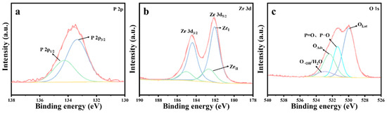 XPS spectra of ZrO2 catalysts following the completion of reaction: (a) P 2p, (b) Zr 3d, and (c) O 1s.