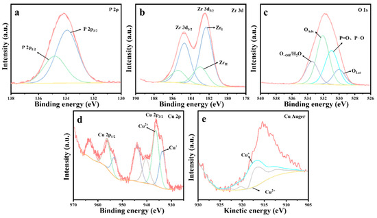 XPS spectra of 10%Cu/Zr catalysts after reaction: (a) P 2p, (b) Zr 3d, (c) O 1s, (d) Cu 2p, and (e) Cu Auger.