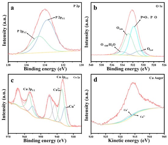 Figure 12 presents the XPS spectrum of the CuO catalyst after the reaction. As shown in Figure 12a, the appearance of P 2p energy peaks on the surface of the deactivated CuO catalyst following the thermocatalytic decomposition of DMMP confirms the presence of residual phosphorus-containing species. Similarly, XPS spectral fitting analysis (Figure 12b) identified the presence of lattice oxygen (OLat), adsorbed oxygen (OAds), adsorbed water/hydroxyl oxygen (O-OH/H2O), P=O, and P-O species. Furthermore, both Cu+ and Cu2+ species were detected in the catalyst (Figure 12c,d). A comparison of the catalyst before and following the reaction revealed a significant depletion of lattice oxygen, accompanied by an increase in Cu+ content and a corresponding decrease in Cu2+ content, as summarized in Table 6.