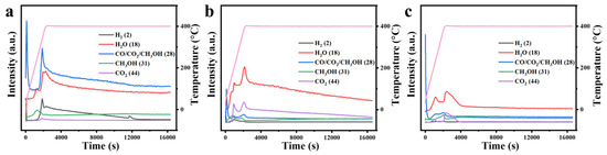 The gaseous products generated at different temperatures during the reaction were analyzed using a CATLAB microreaction system equipped with mass spectrometry. As shown in Figure 13, the exhaust gases from all three catalysts contained CH3OH, H2, CO2, and H2O. In the thermocatalytic decomposition of DMMP, the formation of H2 is primarily associated with the cleavage of C-H bonds [47]. For the ZrO2, CuO, and 10% Cu-Zr catalysts, the concentration of H2 initially increases with rising temperature before subsequently decreasing. This trend can be attributed to the enhanced cleavage of C-H bonds within the DMMP molecule at higher temperatures, which promotes H2 formation. However, at elevated temperatures, the decline in H2 concentration may result from the formation of other hydrogen-containing products, such as H2O, through secondary reactions. Similarly, the concentration of methanol increases and then decreases within a specific temperature range. This behavior can presumably be ascribed to the existence of hydroxyl moieties on the catalyst surface and the water generated during the reaction, both of which can act as nucleophilic agents, facilitating the replacement of the -OCH3 in DMMP and leading to CH3OH formation [17,48,49,50]. With increasing temperature, hydrolysis is enhanced, resulting in a rise in methanol concentration. However, at higher temperatures, the methanol concentration declines while CO2 levels increase, likely due to the oxidation of methanol to CO2. Furthermore, the gaseous products may include CO, as indicated by the charge-to-mass ratio of 28 in the mass spectrometry analysis. The presence of CO suggests incomplete oxidation, potentially caused by an insufficient oxygen supply during the catalytic process.