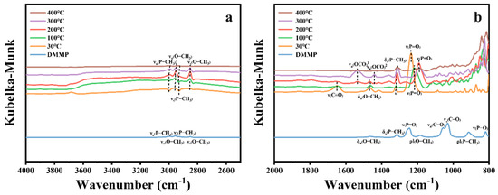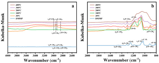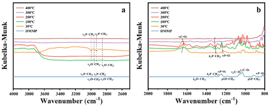 Figure 16 presents the in situ DRIFTS spectra of DMMP decomposition catalyzed by CuO at different temperatures. The figure shows that the intensities of the νa(P–CH3), νs(P–CH3), νa(O–CH3), and νs(O–CH3) peaks in the high-frequency region gradually decrease with increasing temperature, suggesting the progressive decomposition of DMMP. In the low-frequency region (Figure 16b), the δa(O–CH3), ρ‖(O–CH3), νa(C–O), νs(C–O), and ν(P–O) vibrational peaks disappear at 400 °C, indicating the complete oxidation of methoxy groups. The ρ‖(P–CH3) mode also vanishes at 400 °C, while δs(P–CH3) remains detectable, suggesting that the P–CH3 bond is more resistant to cleavage. The ν(P=O) vibrational mode disappears as early as 100 °C, indicating the cleavage of the phosphoryl bond. A broad set of overlapping peaks in the 1200–800 cm−1 region becomes more pronounced with increasing temperature, attributed to the generation of phosphorus-containing and carbon–oxygen species on the CuO surface [13,53].