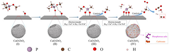 Based on the above analysis and the relevant literature, we propose that ZrO2, CuO, and CuO/ZrO2 catalysts follow similar catalytic decomposition pathways, as illustrated in Figure 17. Initially, DMMP molecules adsorb onto the Lewis acidic sites of the catalysts and/or interact with surface hydroxyl groups via H-bonding (step I). Subsequently, the hydroxyl groups on the catalyst surface sequentially replace the two methoxy groups in DMMP through nucleophilic substitution, leading to the formation of gaseous methanol and phosphorus-containing surface species (step II and III: C3H9O3P + CuO/ZrO2-OH → C2H6O3P-CuO/ZrO2 + CH3OH and C2H6O3P-CuO/ZrO2 + CuO/ZrO2-OH → CH3O3P-CuO/ZrO2 + CH3OH). Methanol then undergoes further oxidation and decomposition, generating CO2, CO, and H2O. Methanol can also react with hydroxyl groups or lattice oxygen on the catalyst surface, producing various carbon–oxygen by-products (step IV: CH3OH + O2 → CO2/CO + H2O + H2). Unlike pure ZrO2 and CuO, the CuO/ZrO2 catalyst benefits from the synergistic interaction between Cu and Zr, which facilitates electron transfer and enhances oxygen mobility. This improved oxygen transfer further promotes oxidative cycling reactions, contributing to more efficient catalytic decomposition.