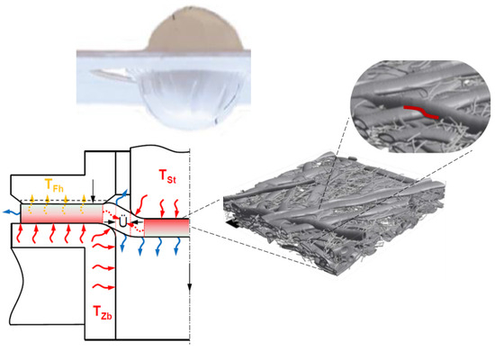 The thermoforming process is shown schematically in Figure 1. The micro-structure of the board is reconstructed from micro-CT scans, as shown in the same figure, and it determines the effective thermal conductivity of the board. The heating temperature of the device does not change along the flat parts of the board; therefore, the thermal conduction problem with diffusion and evaporation will be reduced to a one-dimensional heat conduction problem coupled with moisture diffusion through an effective (homogenized) wall; see Figure 1.