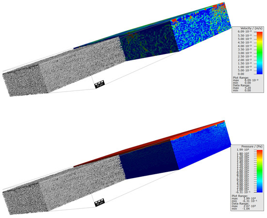 Water flowing through the paperboard with a single boundary layer, as shown by micro-CT scans. The velocity is on the left and the pressure distribution is on the right.