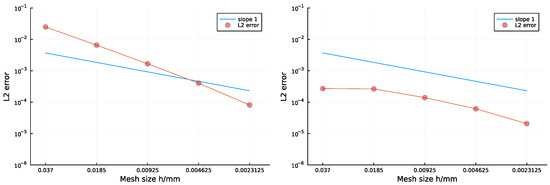 Log-plot of error with , minimal s, maximal = 10,241 s. The (left) figure is just the heat conduction, while the (right) figure demonstrates the numerical error for the non-linear model, the coupled diffusion and heat conduction with evaporation.