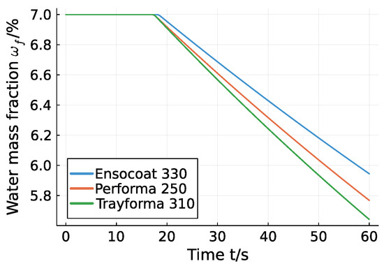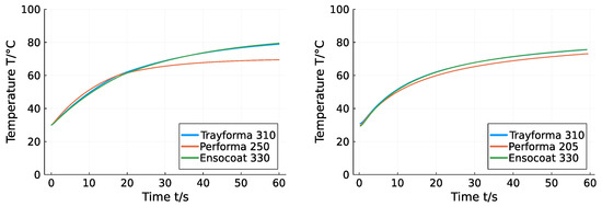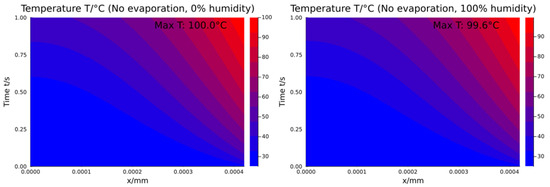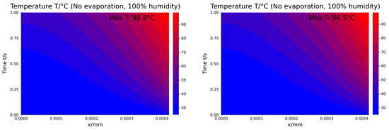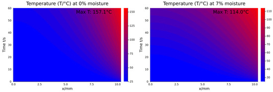 Figure 4 demonstrates the influence of the initial moisture content. The left image is without initial moisture, and in the right one, . Figure 5 and Figure 6 demonstrate the difference in temperature evolution over the wall for constantly moist (without diffusion and evaporation) and dry paperboards for all three considered paperboards. The aim here was to obtain an estimate of the difference in macroscopic heat conduction before and after the evaporation.