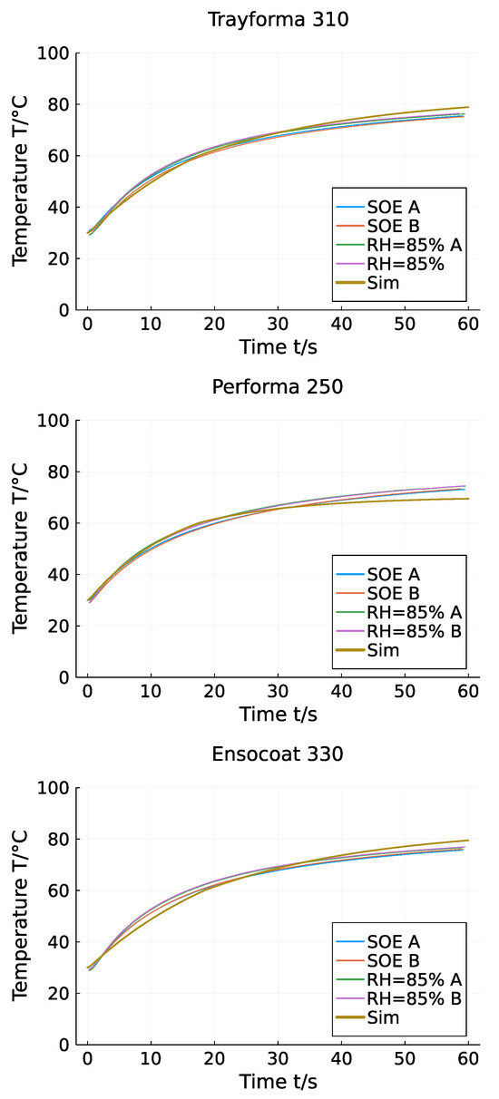 Simulation vs. experiments for Trayforma 310, Performa Light 250, and Ensocoat 330 (SOE: standard operating environment; RH = 85%: relative humidity).
