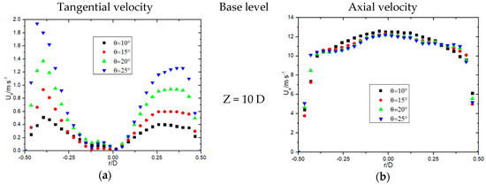In terms of axial velocity, the maximum values are concentrated along the pipe axis. Axial velocity diminishes progressively closer to the pipe wall, with a distinct asymmetry: the left axial velocity is slightly lower than the right, consistent with the observation that the left tangential velocity exceeds the right. This phenomenon can be attributed to the swirling flow dynamics induced by the twist tape’s geometry and placement. The placement angle further influences the behavior of axial velocity maxima as the flow progresses downstream. For pipes with placement angles of θ = 10° and 15°, the axial velocity maxima increase significantly after crossing the reference plane at Z = 10 D. Maximum speed increased by 18.2%. The maximum velocity area contracts towards the pipe axis, and the velocity profile becomes increasingly pointed, indicating enhanced flow concentration. Conversely, for placement angles of θ = 20° and 25°, the axial velocity maxima exhibit a slight decrease, suggesting a trade-off between tangential and axial flow intensities at higher placement angles. At Z = 30 D, the tangential velocity remains robust, particularly for larger placement angles, indicating sustained swirl flow. However, as the flow progresses to Z = 50 D, the tangential velocity begins to decay slightly, though it remains sufficiently high to prevent hydrate particle deposition on the pipe walls. This highlights the importance of optimizing placement angles to balance the tangential and axial velocity components, thereby enhancing the flow’s ability to transport hydrate particles without blockages.