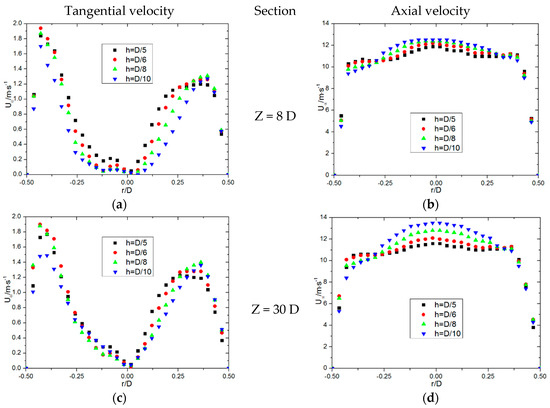 Influence of the height of twist tape on different sections on tangential and axial velocities: (a) Tangential velocity (Z = 8 D), (b) Axial velocity (Z = 8 D), (c) Tangential velocity (Z = 30 D), (d) Axial velocity (Z = 30 D), (e) Tangential velocity (Z = 47 D) and (f) Axial velocity (Z = 47 D).
