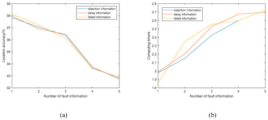(a)The accuracy rate of fault location under different information fault conditions. (b) The computing time under different information fault conditions.