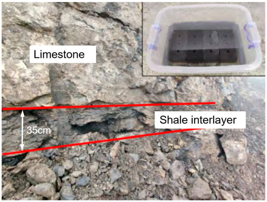 The samples utilized in this study were collected from interlayer shale in a limestone mine in the east of Southwest of China (Figure 1) [20]. The mine area is prone to landslides, and many disasters have been attributed to high moisture contents and major deformation of the weak interlayer after heavy rainfall [21,22,23]. Shale blocks collected from the mine site were transported to the laboratory, and cuboids measuring 150 mm × 75 mm × 75 mm were prepared. Following the preparation, the samples exhibited a polished finish, and the error associated with various dimensions was ±0.02 mm, while the average volumetric weight was 25.6 kN/m3. The composition elements of shale samples (expressed as oxides) were tested by XRD method, including CaO (38.03%), SiO2 (35.83%), MgO (13.03%), and Al2O3 (2.73%).