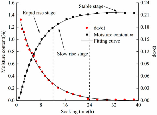 Before the shear tests, shale samples were oven-dried at 110 °C for 24 h and then immersed in water according to the International Society for Rock Mechanics recommendations. The moisture content of each sample was measured at 30 min intervals for a total of 40 h to establish the relationship with time, as depicted in Figure 2 [25]. Before the test, a dry sample was selected, and the moisture contents of the other three samples were measured to be 0.46%, 0.87%, and 1.24% after soaking in water for 4 h, 8 h, and 12 h, respectively. Following the removal of a sample from the water, the surface was slightly dried using a rag. Shear creep tests were then conducted under constant normal stress conditions, and the rest of the samples were wrapped in a waterproof membrane to prevent the loss of moisture. The moisture content of each sample was determined using Equation (1) [26].