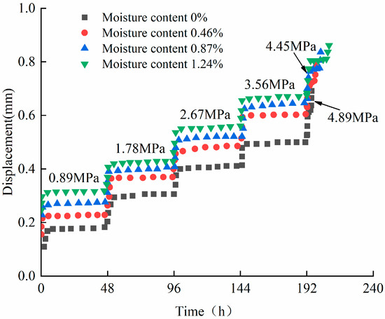 Figure 4 shows the shear creep displacement of samples with four different moisture contents during the five loading steps. The influence of moisture content on the creep characteristics of shale is significant. The larger the moisture content is, the larger the initial displacement and stable creep of the shale sample are. Under the shear force of 0.8 MPa, when the moisture content is 0%, 0.46%, 0.87% and 1.24%, the initial displacements of the samples are 0.10 mm, 0.15 mm, 0.19 mm, and 0.22 mm, respectively, and the displacements in the stable creep stage are 0.18 mm, 0.22 mm, 0.27 mm, and 0.31 mm, respectively.