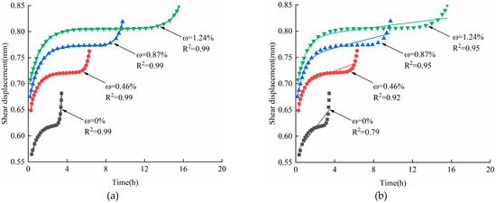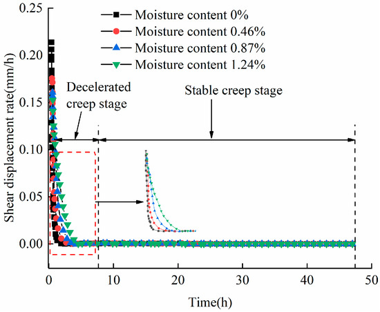 The evolution of the shear displacement rates for samples with different moisture contents under a shear stress of 0.89 MPa is shown in Figure 5. The data in Figure 5 revealed the following: (1) the shear displacement rates of samples with different moisture contents all undergo two stages, including decelerated creep and stable creep; (2) the shear creep rates of the samples were characterized by a monotonically decreasing trend and the values eventually approached zero; (3) the lower the moisture content, the higher the initial shear creep rate and the shorter the duration required to reach the stable creep stage. In summary, it can be inferred that moisture content has a significant impact on the creep rate of shale. When the shear stress is less than the yield limit , the creep deformation of samples with different moisture contents ultimately stabilizes at a certain value. The moisture content of the sample affects the time required for deformation to stabilize at a certain value. Therefore, the moisture content can be regarded as a damage factor affecting the creep deformation of soft rocks.