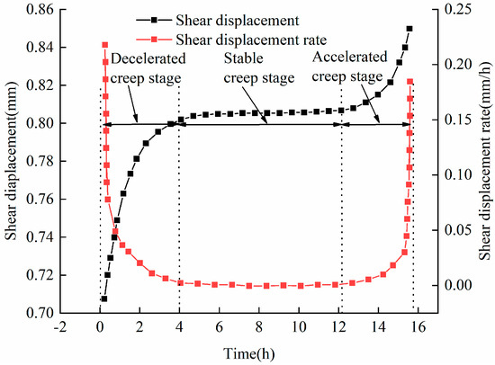 The shear displacement rate of a shale sample with a moisture content of 1.24% under a shear stress of 4.45 MPa is shown in Figure 6. The shear creep of the specimen was characterized by decelerated, stable, and accelerated creep stages. After approximately 12 h, in the accelerated creep stage, the shear deformation of the rock sample suddenly increased and then failure occurred [27]. The shear displacement rate shows a ‘U’ shape with the change in shear stress loading time. Within 4 h of shear loading, the rock sample is in the decelerated creep stage, and the shear displacement rate gradually decreases with the duration of shear loading. In the shear loading of 4~12.1 h, the rock sample is in a stable creep stage, and the shear displacement rate remains stable at about 0. When the shear loading reaches 15.8 h, the rock sample enters the accelerated creep stage, and the shear displacement rate begins to increase continuously. When the rock sample is destroyed, the shear displacement rate rises sharply. In short, the water-bearing rock sample and the dry rock sample have the same shear creep evolution characteristics. When the moisture content is 1.24%, the shale sample still has the characteristics of three stages of shear creep failure.