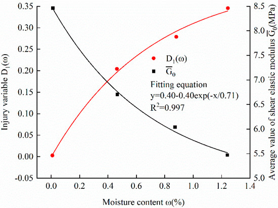 Water can weaken the mechanical strength of the rock and increase the creep deformation of the rock [28,29]. To characterize the influence of moisture content on the shear creep properties of a rock, a damage factor D (ω) was introduced [30]. The relationship given in Equation (6) was established between the moisture content and the instantaneous shear elastic modulus as follows: