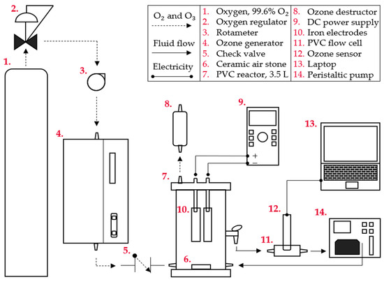 The ECO setup used to carry out this investigation is shown in Figure 1. The reactor is constructed of a 3.5 L section of a clear PVC cylinder with PVC bottom and top. The bottom has a bulkhead connecting the ozone flow to a 3-inch ceramic air stone, producing medium bubbles. Two other bulkheads at the bottom and middle of the tank allow for a constant 1.5 L/min recirculation of reactor water through chemically resistant Tygon tubing and a peristaltic pump. This mixes the bulk while allowing for the separation of a DO3 electrode from the iron electrodes housed in a custom PVC flow cell [38]. The top has an outlet for gas to flow through an ozone destructor before venting and two holes for steel rods to pass through, connecting the DC power supply to the submerged electrodes.