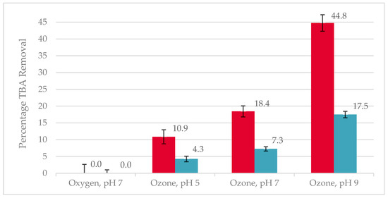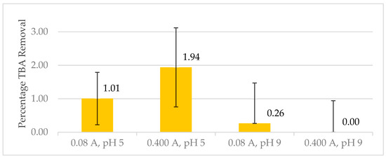 Three ANOVA tests were conducted to compare the effects of pH and applied current on TBA removal. A Games–Howell means confidence interval comparison showed no significant differences in TBA removal. The least insignificant difference was a 1.24% reduction in removal between the pH 5 and 9 groups with p = 0.064. No significant difference in TBA removal was expected between groups since TBA is completely miscible with water [105]. A summary of the ANOVA tests is included in Supplementary Materials (Section S2.3). These findings support the idea that essentially all removal observed is obtained by some degradation pathway ozone.