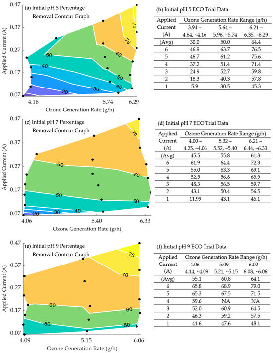 The results of the ECO trials with an initial pH of 7 are shown in Figure 4c,d. The highest removal rates were similar to the pH 5 results, as were the lowest. The lower levels of applied current at pH 7 had significantly higher removal rates compared to the pH 5 trials. The rising minimum removal rate is also seen comparing the pH 9 trials to those from the lower two pH groups. This effect is attributed to the increased pH itself, as the increase in hydroxide ion concentration increased the rate of ozone decomposition (discussed in Section 3.2.2) [103,104].